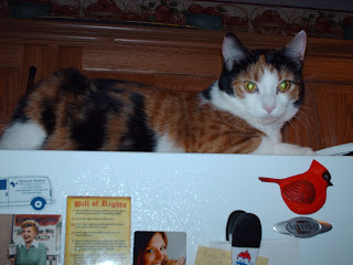 This is Pepina, just relaxing on top of the refrigerator. Really, she's just waiting for someone to open the refrigerator door so she can have some turkey!